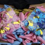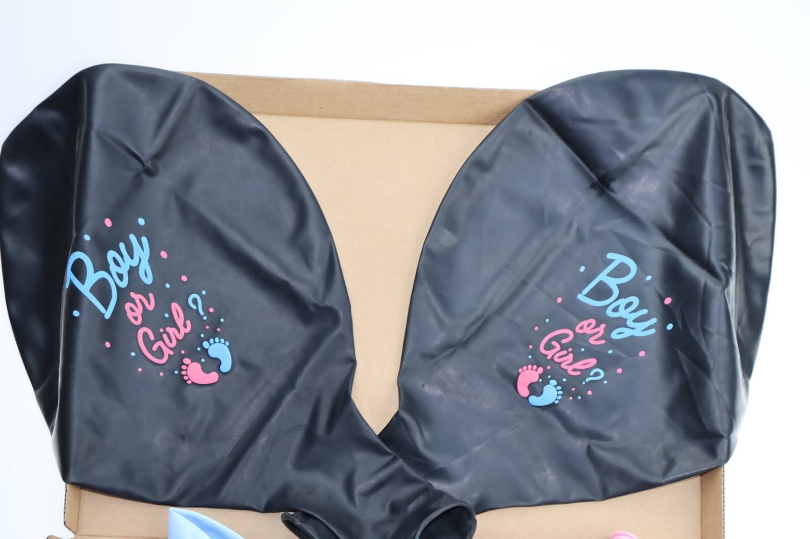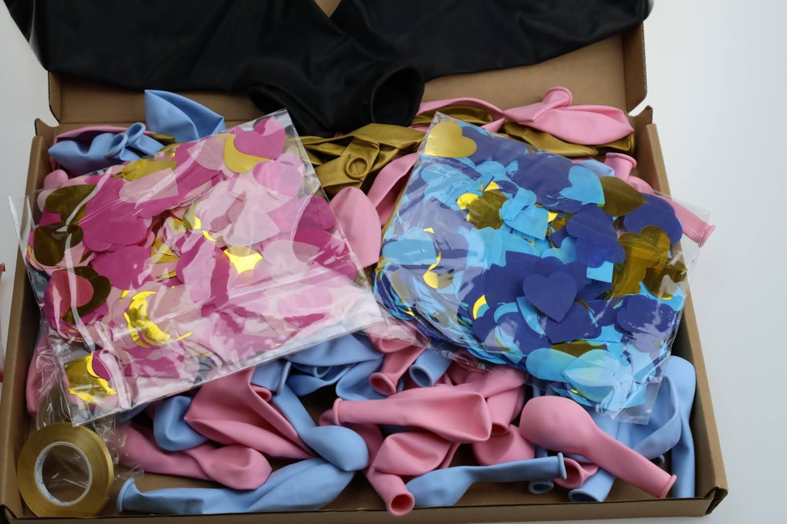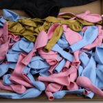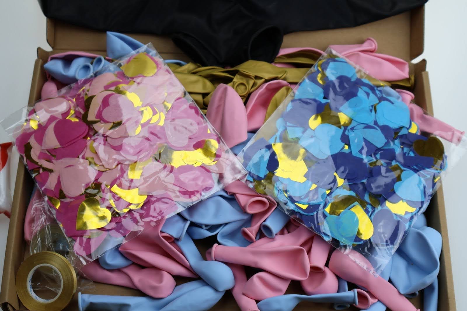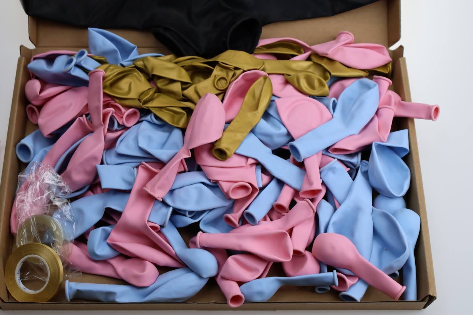 • różowe i niebieskie balony w różnych rozmiarach,