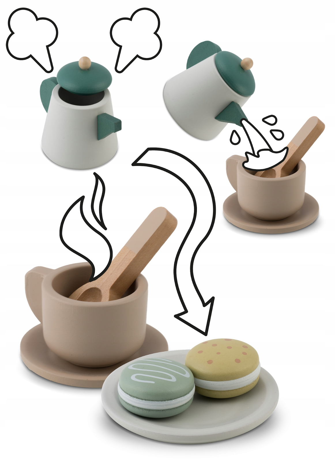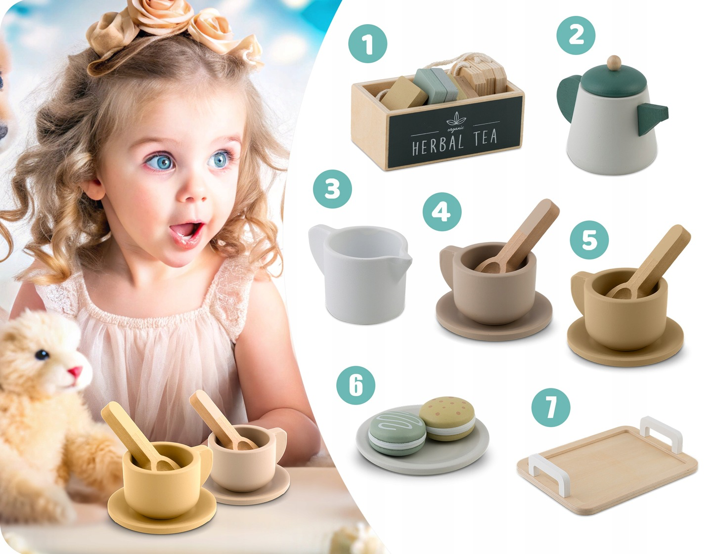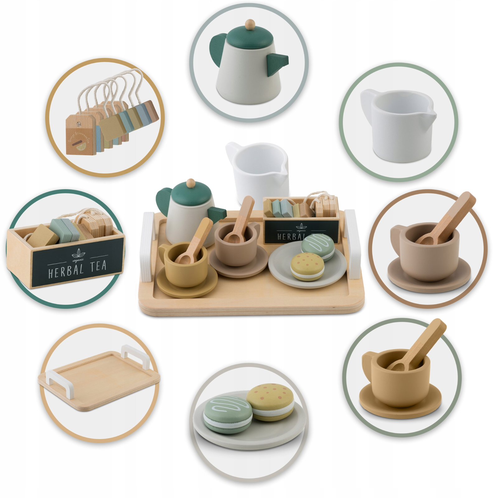 W zestawie znajdują się wysokiej jakości drewniane elementy, takie jak dzbanek, filiżanki, łyżeczki czy tacka do serwowania. Można też na niej podać makaroniki, a do filiżanek włożyć dołączone saszetki z herbatą, co dodaje całej scenie autentyczności i pozwala dziecku wyprawiać eleganckie przyjęcia.