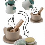 Zestaw do herbaty z różnymi elementami do układania i przenoszenia stymuluje koordynację ręka-oko oraz rozwija precyzję ruchów.