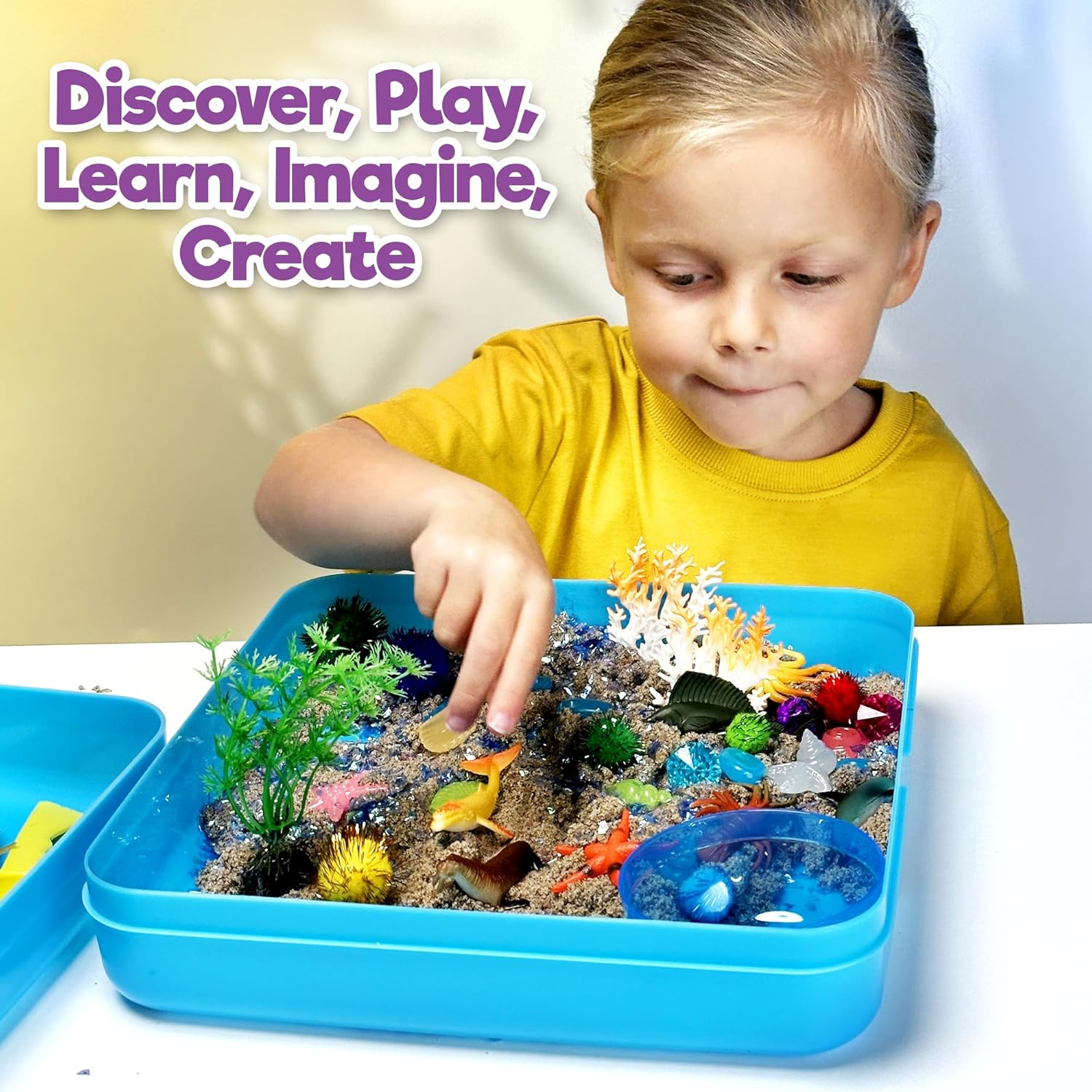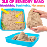 - Kreatywna zabawa – dziecko może odkrywać ukryte elementy (np. muszelki czy figurki) w kolorowym piasku, co pobudza ciekawość i wyobraźnię.