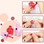 W kuferku znaleźć można separator, pilnik, dwa lakiery do paznokci oraz piękne, dziewczęce, kolorowe naklejki. Separatory nakłada się na palce, aby te nie stykały się ze sobą. Po pomalowaniu paznokci, całość stylizacji dopełnią wyjątkowe naklejki.