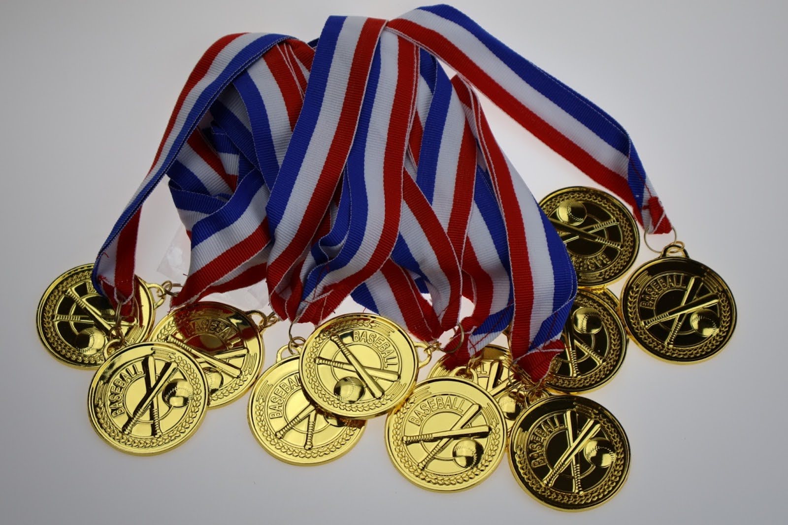 Zestaw 12 metalowych medali za udział lub zwycięstwo w turniejach baseballowych. Świetne jako nagrody sportowedla drużyn, szkół, klubów lub na imprezy sportowe. Każdy medal ma ok. 5 cm średnicy, z wstążką do zawieszenia.