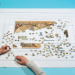Puzzle Pad wykonana jest z miękkiego, ale wytrzymałego materiału (struktura filcu/poliestrowa), który zapewnia stabilne ułożenie puzzli i chroni je przed przesuwaniem się. Na macie znajdują się wyraźne ramki dopasowane do popularnych formatów puzzli – od 500 do 3000 elementów, co ułatwia odpowiednie rozmieszczenie układanki.