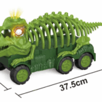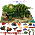 Interaktywny transporter‑dinozaur – pojazd z przodu posiada czaszkę i łapy dinozaura; światła LED w oczach oraz realistyczne efekty dźwiękowe – ryk i dźwięk silnika po naciśnięciu guzika.Napęd i ruch – porusza się do przodu, do tyłu i skręca, zapewniając dynamiczną zabawę.Zestaw akcesoriów – w komplecie przenośna „klatka”‑kadłub, figury dinozaurów, jaja, skały, płotki, drzewa, matę do zabawy (np. 70×45 cm) – tworzą scenę prehistoryczną
