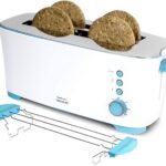 • Długi toster z podwójną szczeliną z miejscem na cztery kromki tostów, moc 1350 W, szeroka szczelina do zastawiania grubych lub dużych chlebów