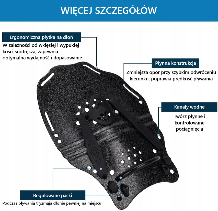 • Ergonomiczna konstrukcja Wypukła powierzchnia wioseł zwiększa przyczepność na wodzie, pomaga pływakowi wyczuć prawidłową pozycję dłoni przy wchodzeniu do wody i umożliwia bezpieczny trening mięśni.