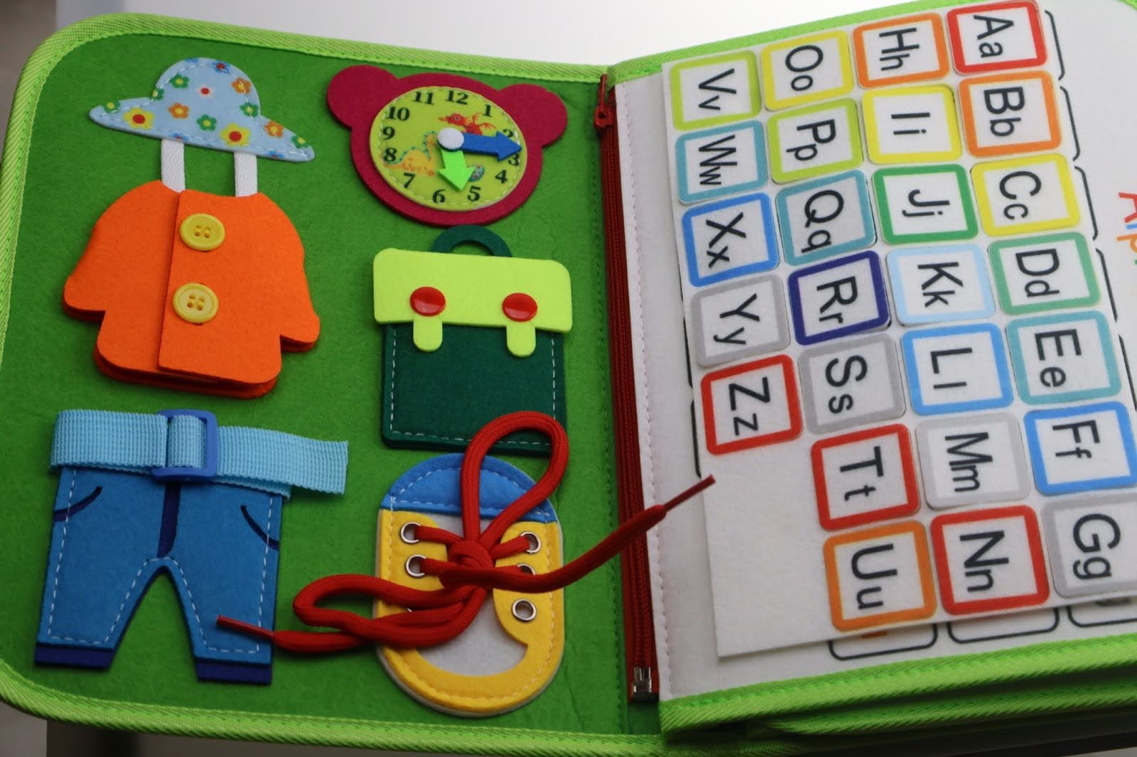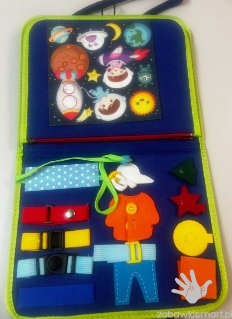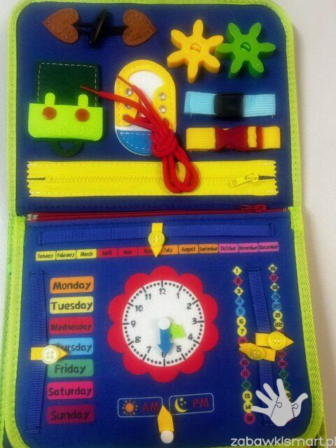 Sensoryczna walizka/książeczka manipulacyjna.Rozwija zmysły: dotyku, wzroku, koordynację a także motorykę rączek i placów