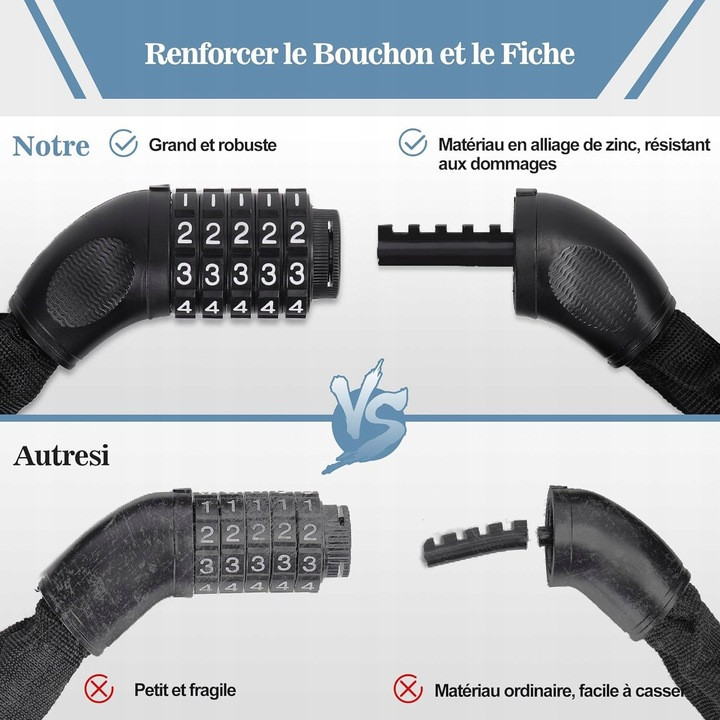 Ulepszony i wzmocniony cylinder zamka i krzywki: cylinder zamka i pułapka są wykonane ze stopu cynku o wysokiej wytrzymałości i są większe i grubsze niż normalne zapięcie rowerowe. Pułapka nie jest tak łatwa do złamania i uszkodzenia, a cylinder zamka nie może być tak łatwo podniesiony.