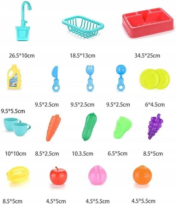 Pełny pakiet do kreatywnej zabawy w kuchnię! Zestaw zawiera sztućce, talerzyki, filiżanki, warzywa, owoce i akcesoria, takie jak płyn do naczyń czy łyżeczki. Dziecko ma wszystko, co potrzebne, by wcielić się w rolę i móc „posprzątać” .